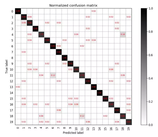 上图表述的是一个包含20个类别的分类任务,混淆矩阵为20*20的矩阵,其中第i行第j列,表示第i类目标被分类为第j类的概率,越好的分类器对角线上的值更大,其他地方应该越小。