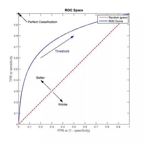 点(0,1):FPR=0, TPR=1,此时FN=0且FP=0,所有的样本都正确分类;
