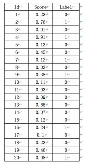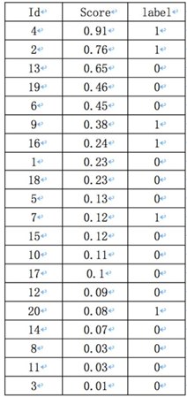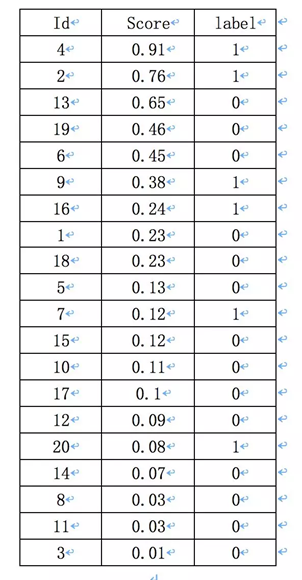 假如一幅图像,有10个人脸,检索出来了20个目标框,每一个目标框的概率以及真实的标签如下,真实标签的计算就用检测框与真实标注框的IoU是否大于0.5来计算。