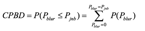 其中分子是基于局部对比度的JNB边缘宽度,而分母是计算出的边缘宽度。对于每一幅图像,取子块大小为64×64,然后将其分为边缘块与非边缘块,非边缘块不做处理。对于每一个边缘块,计算出块内每个边缘像素的宽度。当pblur<63%,该像素即作为有效的像素,用于计算CPBD指标,定义如下: