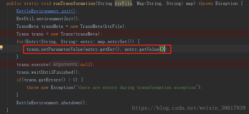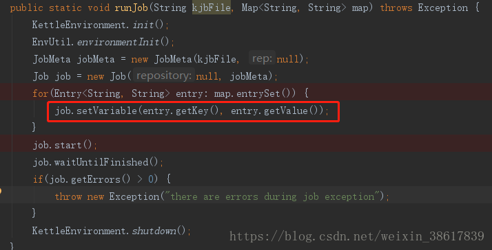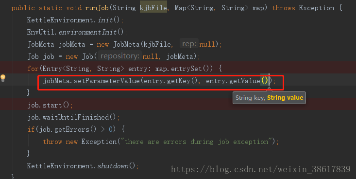 2.2. 通过设置JobMeta的parameterValue可将参数传递给kettle,创建JobMeta时kettle会解析对应得xml格式的.kjb文件,并初始化命名参数的map,创建Job对象kettle并不会像创建Trans那样将TransMeta中的命名参数复制给Trans,所以此时的Job中的命名参数size为0,如果通过job.setParameterValue()函数并不能将我们的参数传递给kettle。