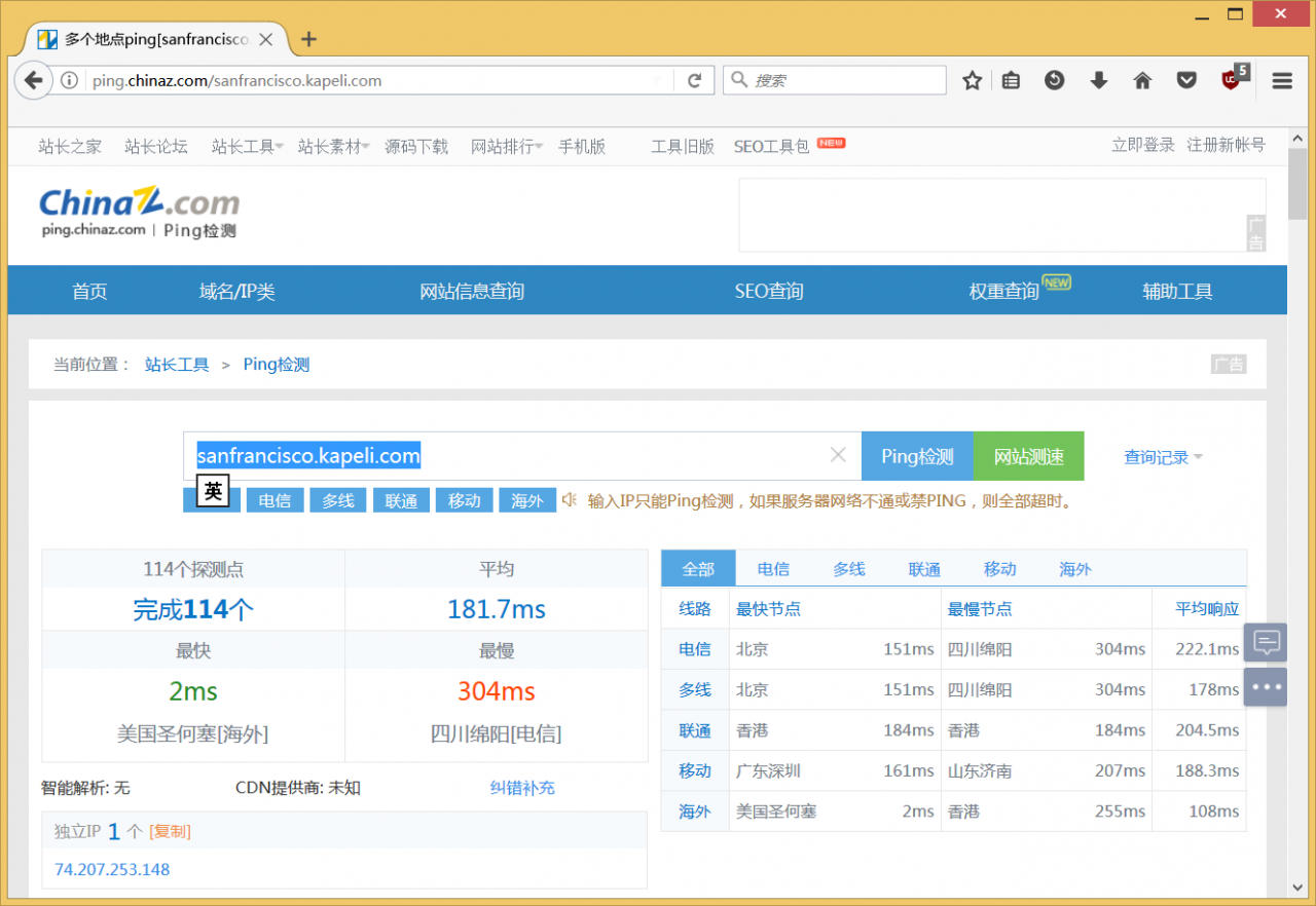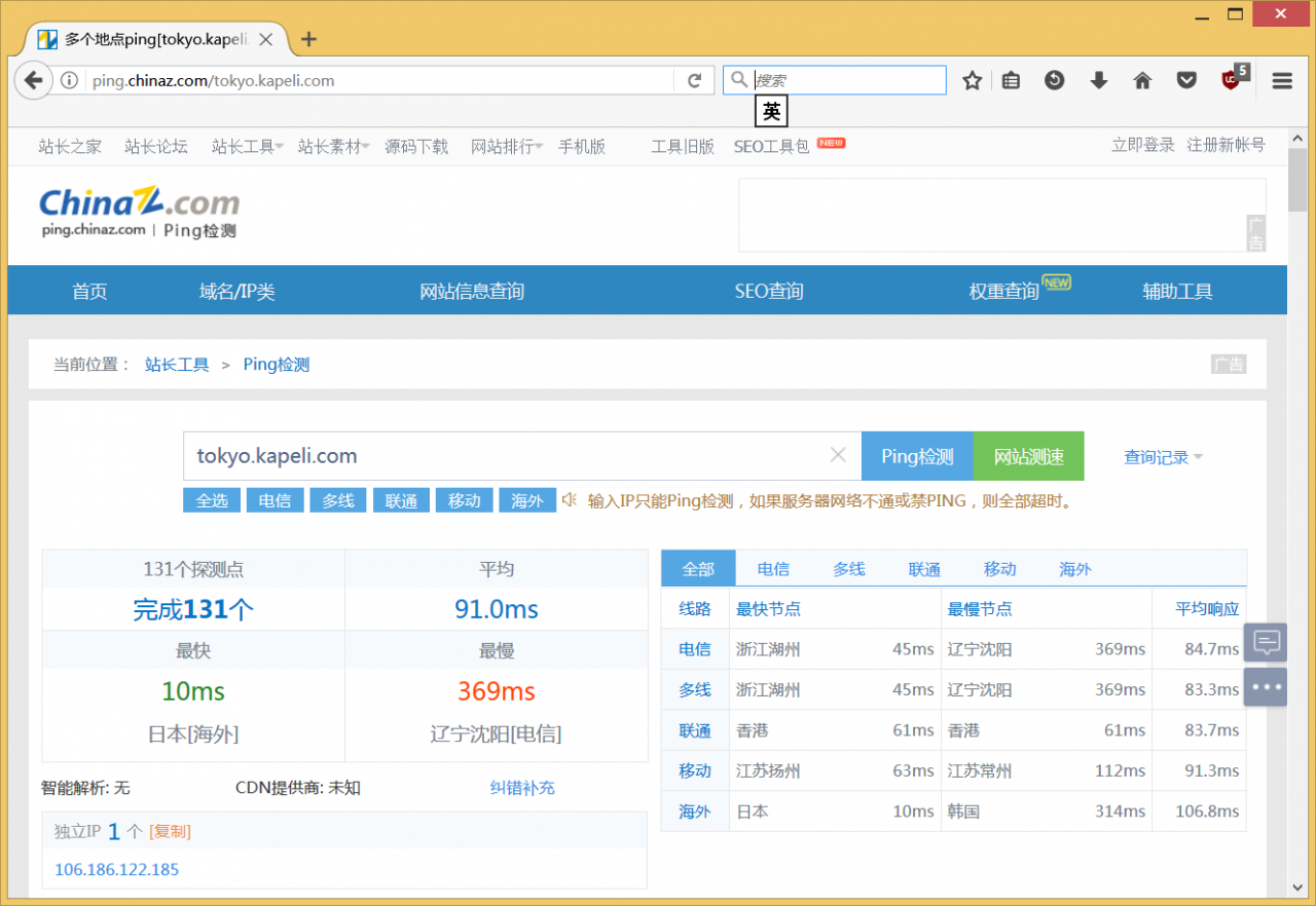 实际上,这些tgz压缩包全部来自Dash的服务器(*.kapeli.com),而且分布在很多城市(frankfurt, london, newyork, sanfrancisco, singapore, sydney, tokyo),这些不同城市的服务器上的内容都是一样的。我们要找到速度比较快的服务器,然后用迅雷批量下载。可以到http://ping.chinaz.com/上进行ping检测,找找你自己所在的地区,看响应时间,时间越短,速度越快。