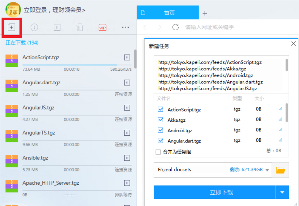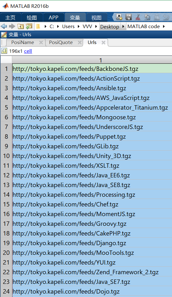 如果你需要下载的tgz包不多,手动将地址一个个复制粘贴到浏览器、百度网盘、迅雷,FDM(Free Download Manager,开源免费),IDM(Internet Download Manager,收费)中倒也无所谓。但我想把这些tgz包全部下载下来,然后传到百度网盘里面,方便大家(下载地址在最后)。那么,如何批量生成下载地址呢?之前从http://api.zealdocs.org/v1/docsets得到的json文件该闪亮登场了。以下Matlab代码可以从json文件中提取tgz包的名称,并与http://tokyo.kapeli.com/feeds/拼接成完整的下载地址。