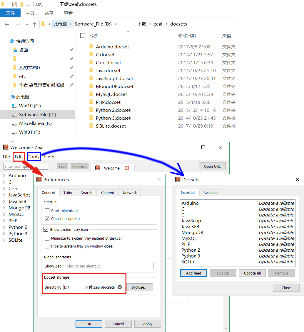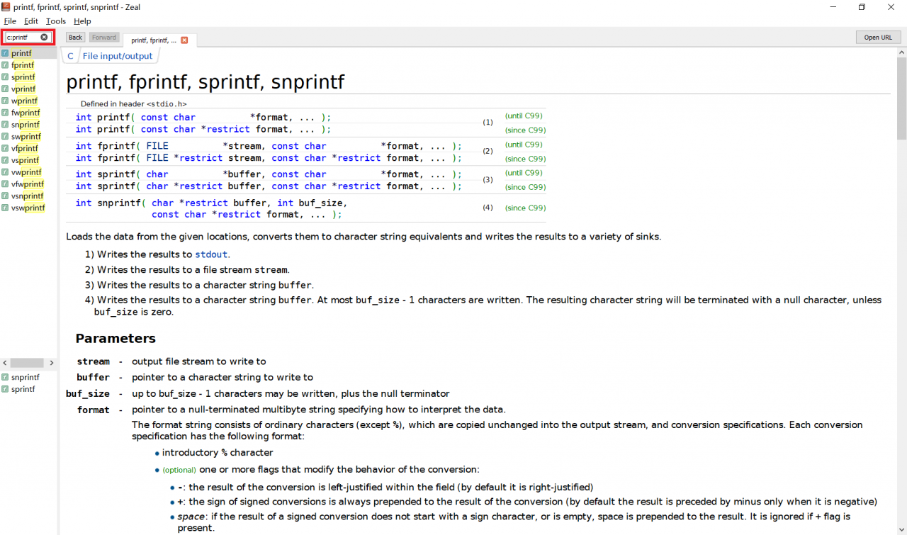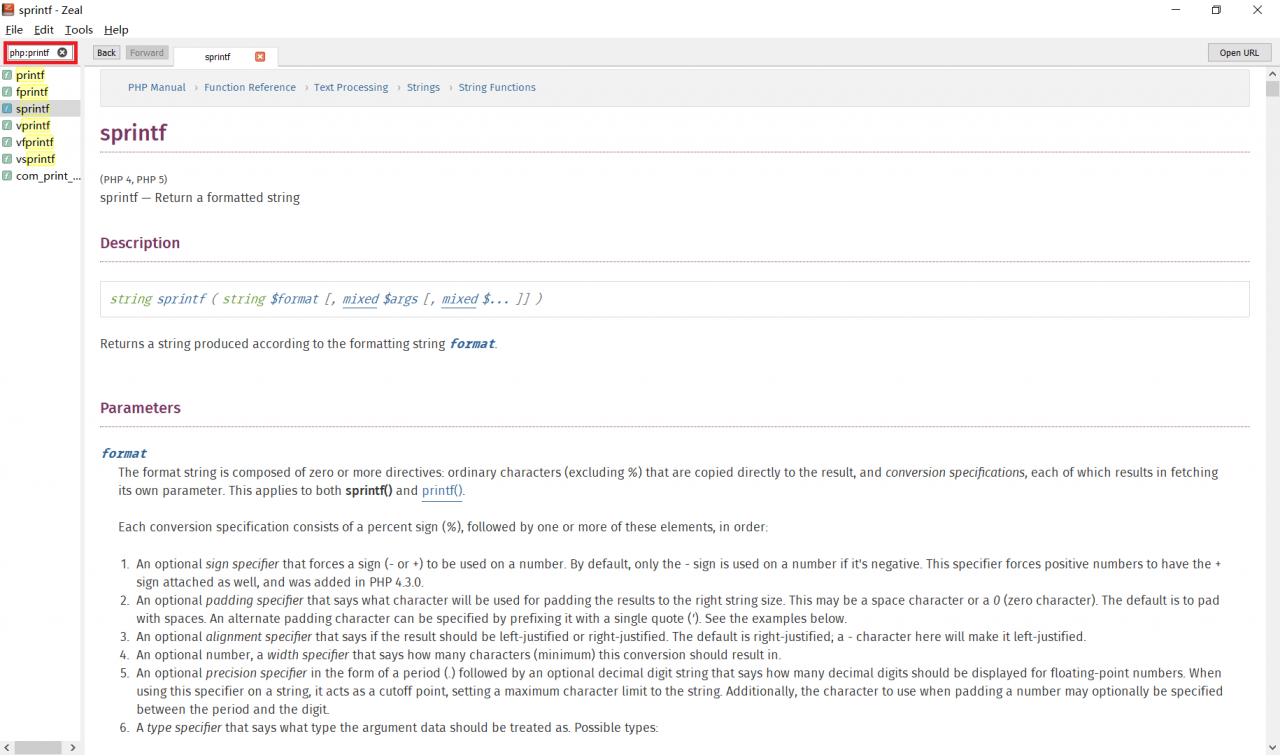 下载完成后,将tgz解压到Zeal的安装路径的docsets文件夹下面,再启动Zeal就能使用搜索功能了。