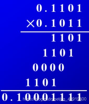 A = -0.1101 B = 0.1011,我们需要计算A*B的值,首先符号位单独处理,这里就知道是负数,数值部分就如图所示(例子来源网上,太懒不想画图了,哈哈哈):