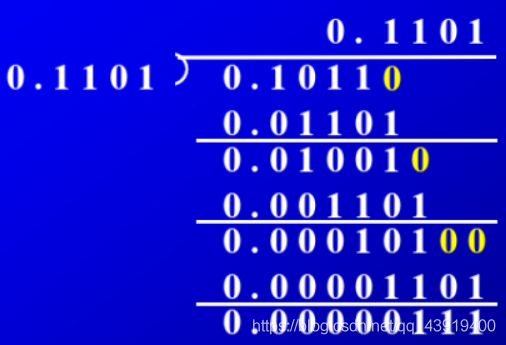 对于手算除法来说,也是和我们小学所学的一致,但我们有几个约定的规则:首先商的符号单独计算,余数不动低位补0减去右移一位的除数。例如X = -0.1011, Y = 0.1101。求X / Y有: