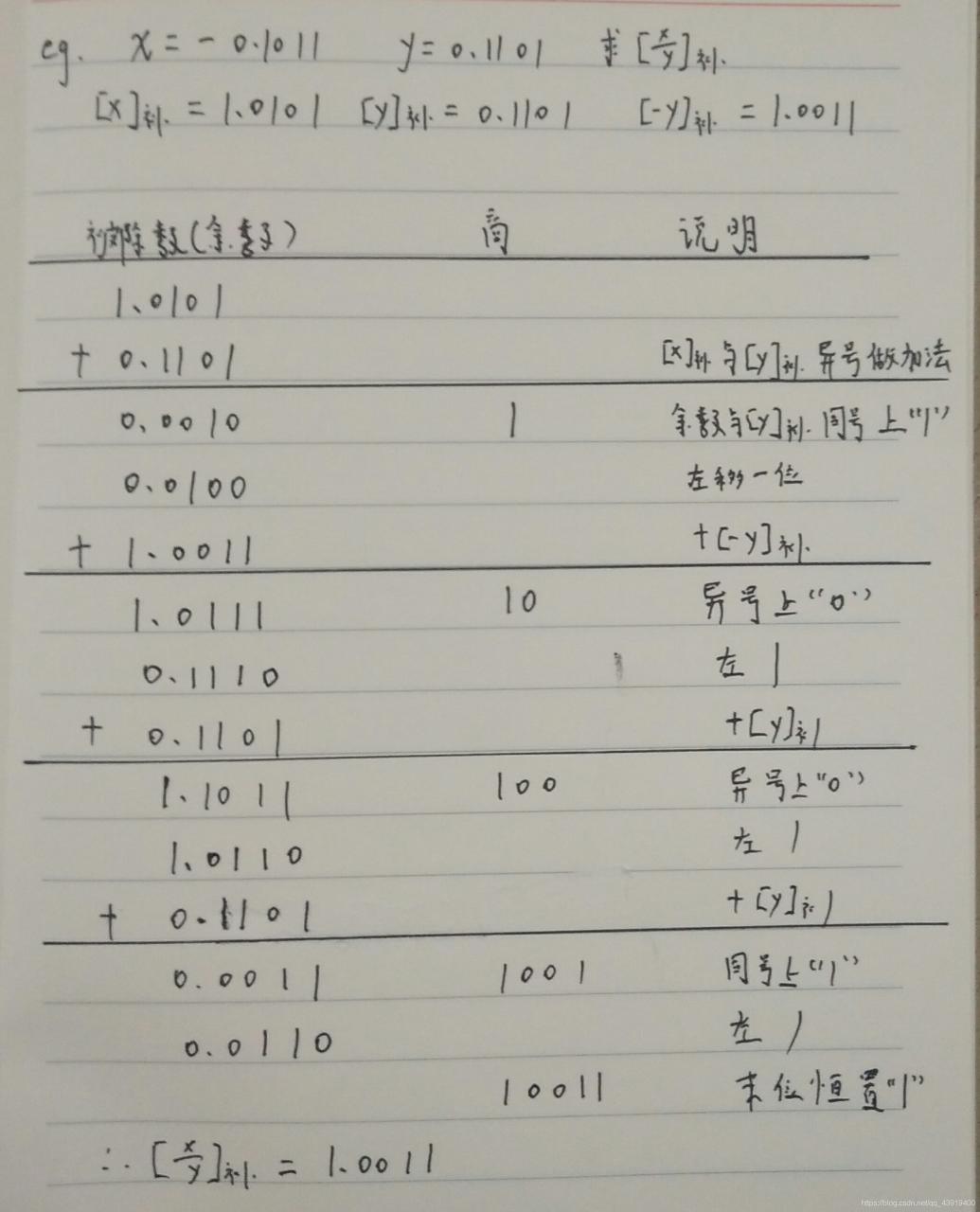 原码相除时,商的符号位由两个符号位相加求得,商的数值位由两数的数值部分相除得到,也就是和上面的手算除法是一至的算法(当然,数值部分的计算用上面的手算是可以的,也可以用下面提到的恢复余数法和不恢复余数法,也就是计算机内部的计算)。