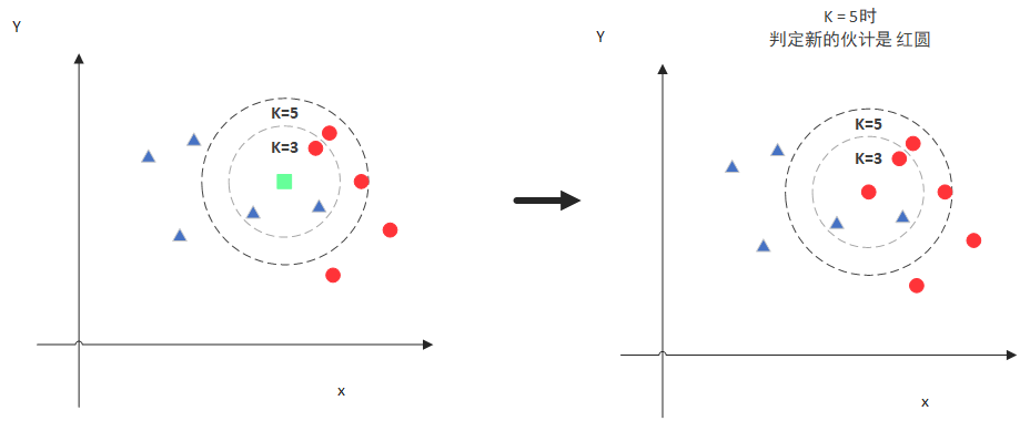 如上图所示,绿色的点为要进行分类的点。如果K=3,与之最近的三个点中,蓝色三角形多,那么绿色的点被归为蓝色三角形一类;如果K=5,与之最近的五个点中,红色圆形多,那么绿色的点被归为红色圆形一类。从此可以得出,K值的选取将影响分类结果。