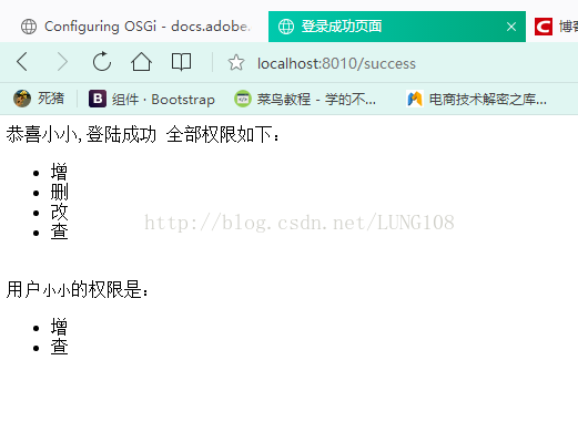 (其实前面已经给出了代码,就是自定义realm中的权限模块和loginsuccess.jsp提到的权限,只需要把自定义realm注掉的list值放开,就可以看到效果)