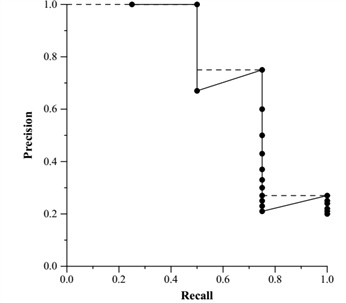 再假设我们认为列表中的Top-3是Positive的,那么同样的最终也能得到这种情况下的Recall和其对应的Precision。如此循环直到Top-N,此时Recall的值一定为1。