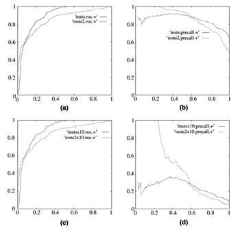 其中 (a)和(b)是分类器在原始测试集(此时正负样本分布平衡)上的预测结果,而(c)和(d)则是将测试集中的负样本数量增加到原来的10倍后,分类器的ROC和PR曲线的评估结果。从中可以清晰地看到ROC曲线可以基本保持不变,而后者则出现了“剧变”。