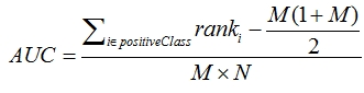 l 第三种方法与第二种方法有点相似,都是直接计算正样本score大于负样本的score的概率,区别在于复杂度降低了。首先我们把所有样本按照score来排序,然后依次用rank来表示他们。比如对于score最大的样本,rank=n (n=N+M),其次为n-1,n-2,以此类推。那么对于正样本中rank最大的样本(rank_max),有M-1个其他正样本比他的score小,那么就有(rank_max-1)-(M-1)个负样本比他score小。其次为(rank_second-1)-(M-2)。因此最后我们得到正样本大于负样本的概率为: