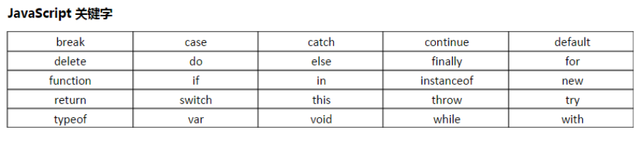 - 关键字:javascript的内置单词,每个关键字都代表某一个计算机操作。