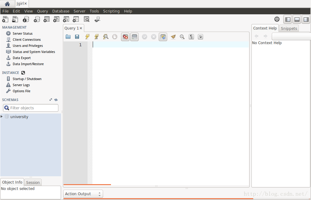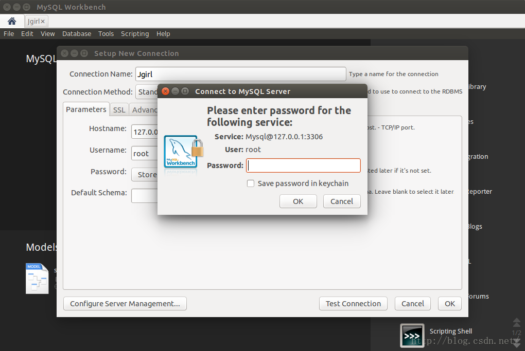 点击“jgirl”连接,出现下图,输入密码后,即可进入MySQL-workbench编辑页面。