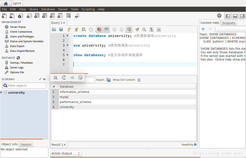 MySQL-workbench编辑页面如图,上面是菜单栏,左下角是数据库列表显示,中间是sql语句编写区域: