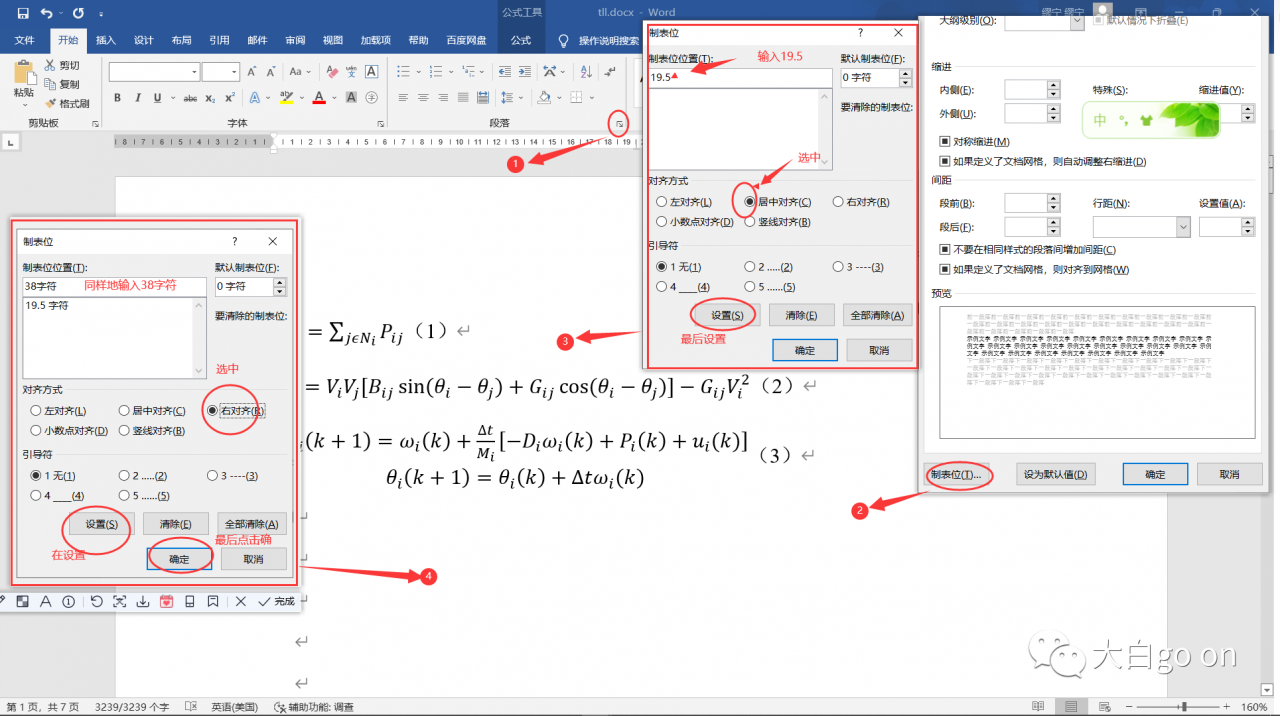我们需要在全选状态下,设置制表位,这样对全文的公式都可以利用tab键直接使用了。步骤——全选 ==》找到制表位设置的地方 ==》设置需要的制表位(在这里我的公式是设置的19.5字符和38字符) ==》完成之后,让编辑处在开头每个公式的起始位置+tab键,随后,让编辑处在标号——如(1)的前面+tab键,就会达到预期效果了。如图所示——