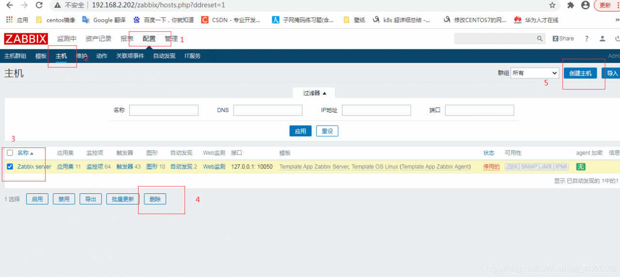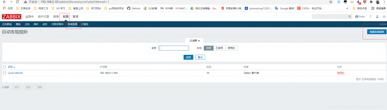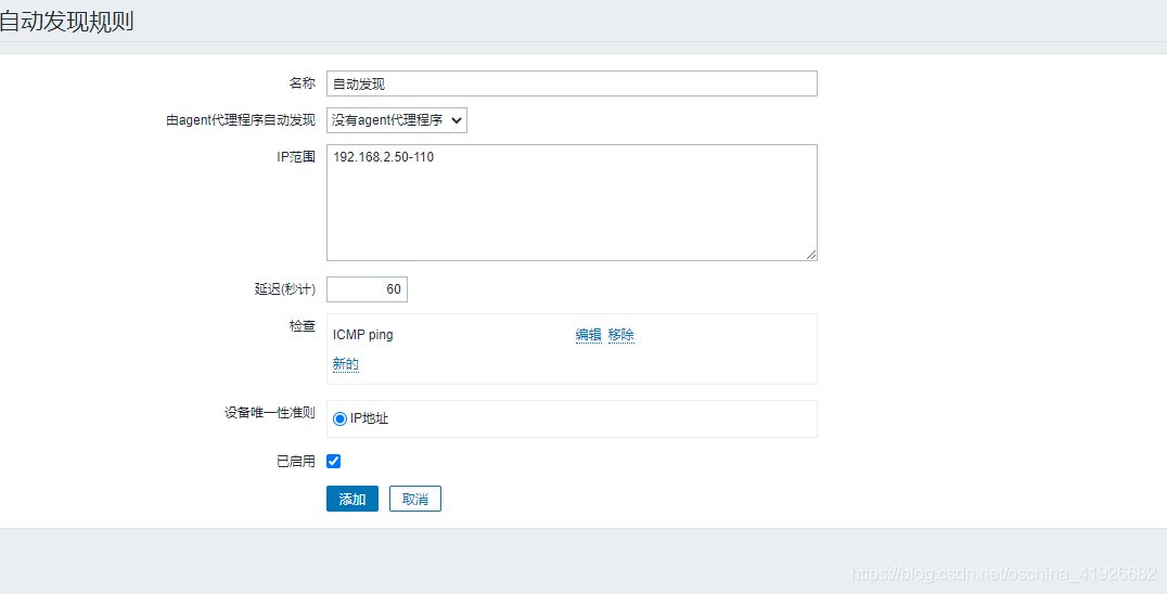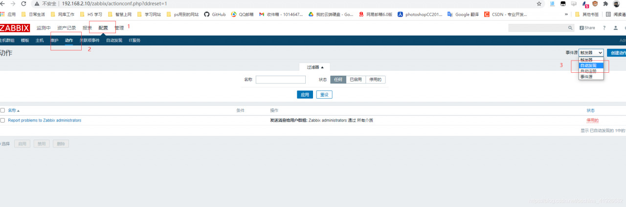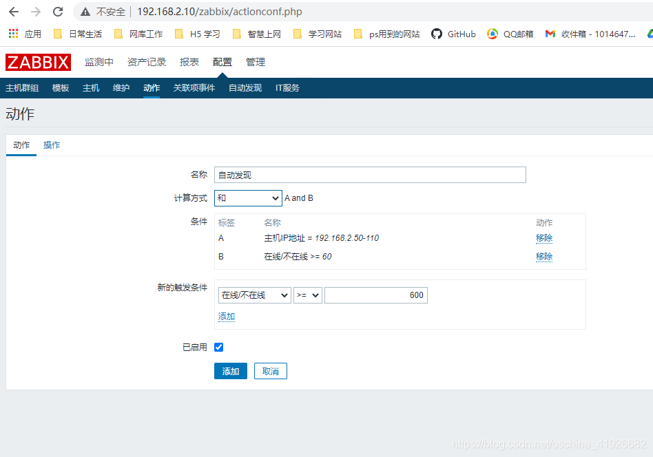 配置==>动作==>自动发现==>创建动作==>名称 触发条件如图 计算方式和