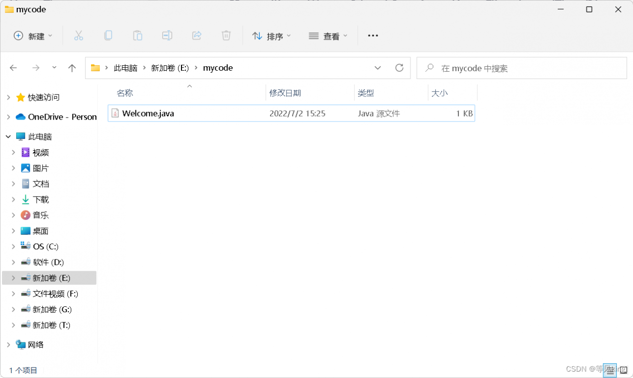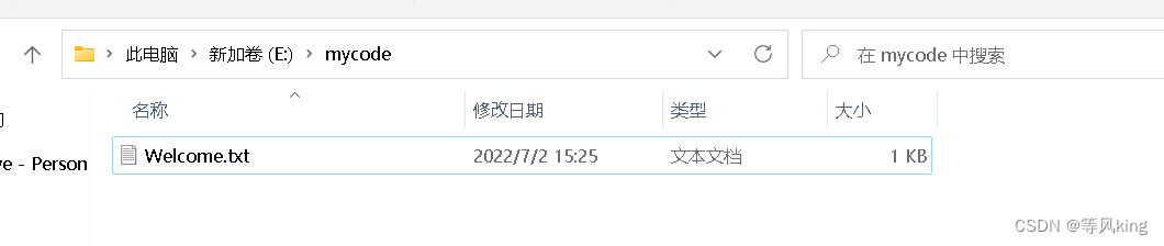比如我这里是在E盘下新建一个mycode文件夹,文件夹里新建一个Welcome.txt文本文档