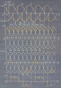 √a=60°时,ud波形中每段线电压的波形继续向后移,ud平均值继续降低。a=60°时ud出现了为零的点,波形见右下图。