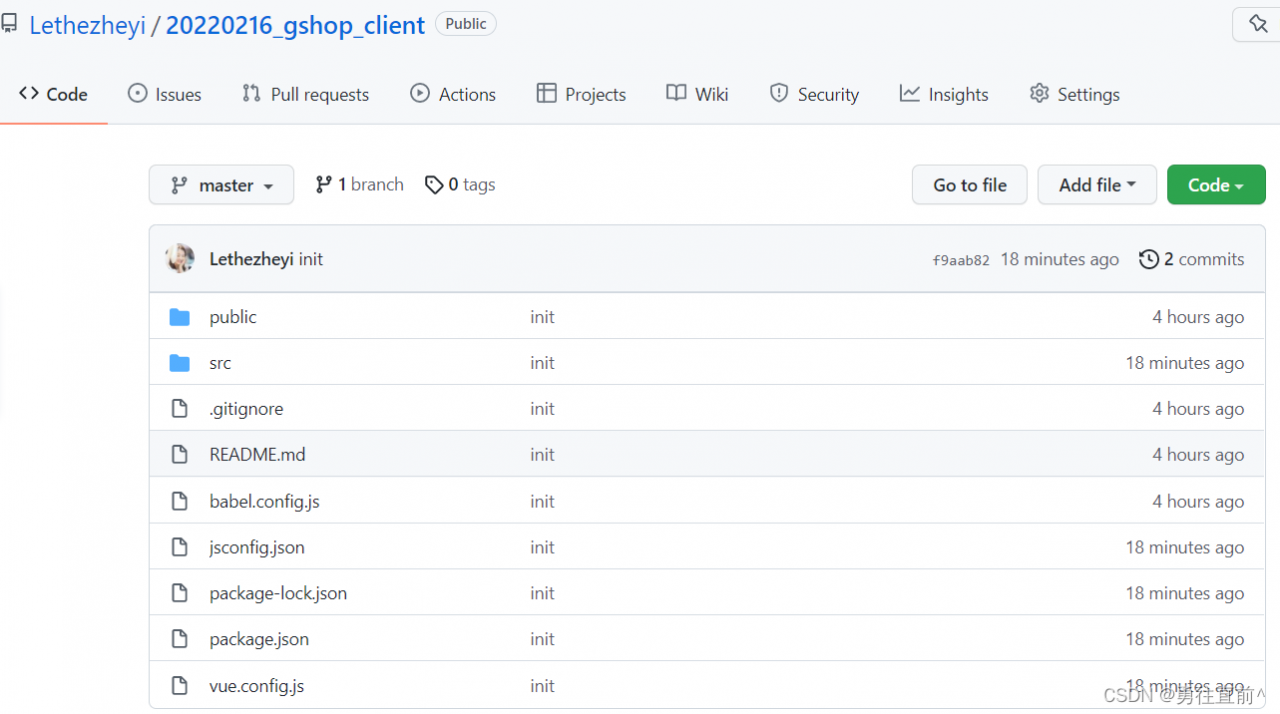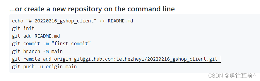 git remote add origin git@github.com:Lethezheyi/20220216_gshop_client.git将代码推送到远程仓库 origin代表你上面为远程仓库取的别名,master表示从本地的master推送到远程的master,此时因为远程的仓库是空的,git会在远程仓库中创建一个master