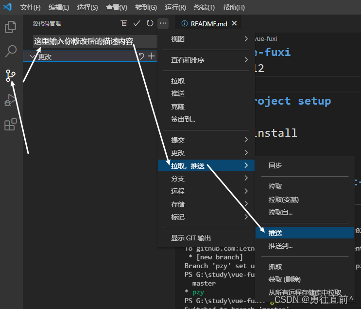 举个栗子:随便修改了README的文件后,将修改的内容推送到远程仓库中: