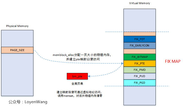 本函数会先分配物理内存,然后借用之前的全局页表bm_pte,建立物理地址到虚拟地址的映射,这次映射的作用是为了去访问物理内存,把内存清零,所以它只是一个临时操作,操作完毕后,会调用pte_clear_fixmap()来清除映射。