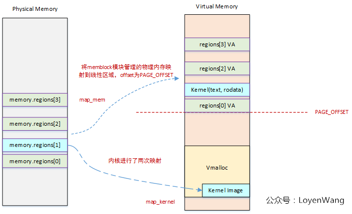 map_mem都是将物理地址映射到线性区域中,我们也发现了Kernel Image中的text, rodata段映射了两次,原因是其他的子系统,比如hibernate,会映射到线性区域中,可能需要线性区域的地址来引用内核的text, rodata,映射的时候也会限制成了只读/不可执行,防止意外修改或执行。