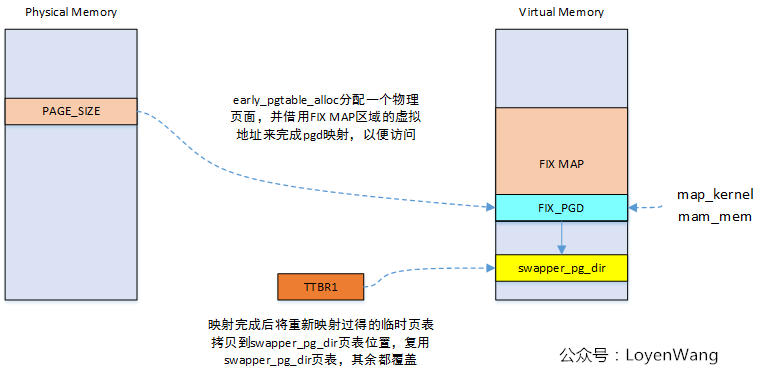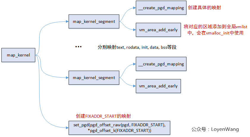 mark 1:分配一页大小的物理内存存放pgd;mark 2:将内核的各个段进行映射;mark 3:将memblock子系统添加的物理内存进行映射;mark 4:切换页表,并将新建立的页表内容替换swappper_pg_dir页表内容;
