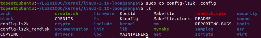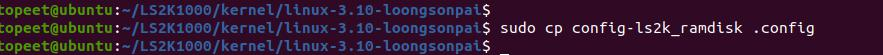 我们输入“sudo cp config-ls2k_ramdisk .config”命令生成内核配置文件“.config”,运行结果如下图所示: