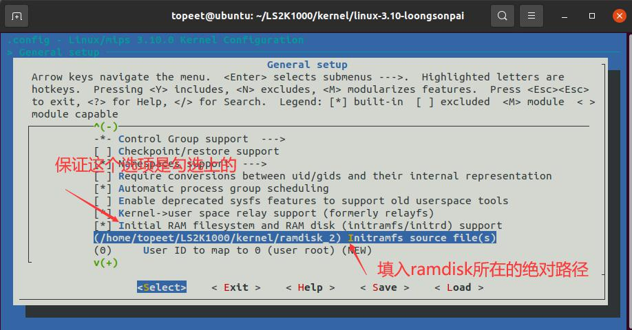 接着我们进到 General setup 选项里面,保证 Initial RAM filesystem and RAM disk (initramfs/initrd)support 选项是勾选上的,然后在 Initramfs source file(s)填入 ramdisk 文件系统所在的绝对路径,作者这里的路径为/home/topeet/LS2K1000/kernel/ramdisk_2。设置完成后如下图所示: