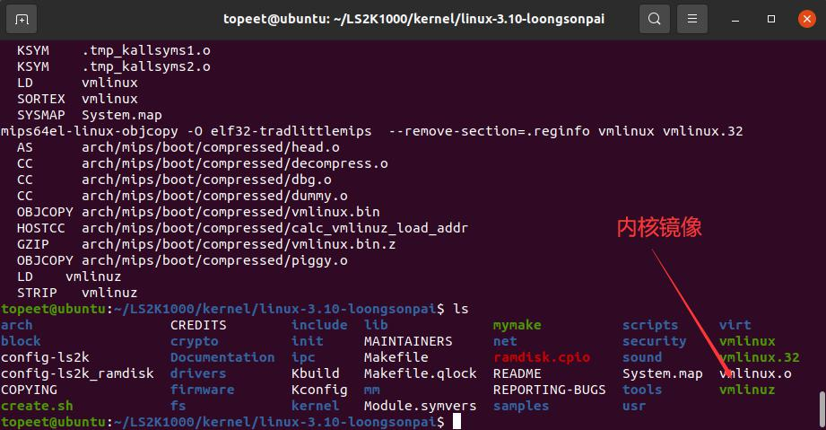 首 先 , 我 们 将 龙 芯 2k1000 的 内 核 源 码 拷 贝 到 Ubuntu 的 任 意 目 录 下 , 使 用 命 令 sudo tar -xflinux-3.10-loongsonpai_20210601.tar.gz 解压源码包得到内核源码并使用命令 cd linux-3.10-loongsonpai 进到内核源码下,注:源码日期大家使用最新的即可。如下图所示: