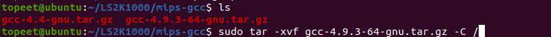 将编译器拷贝到 Ubuntu 的任意目录下,接着使用命令 sudo tar -xvf gcc-4.9.3-64-gnu.tar.gz -C /”解压编译器,如下图所示: