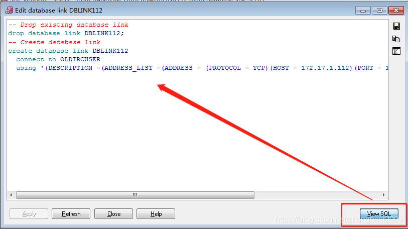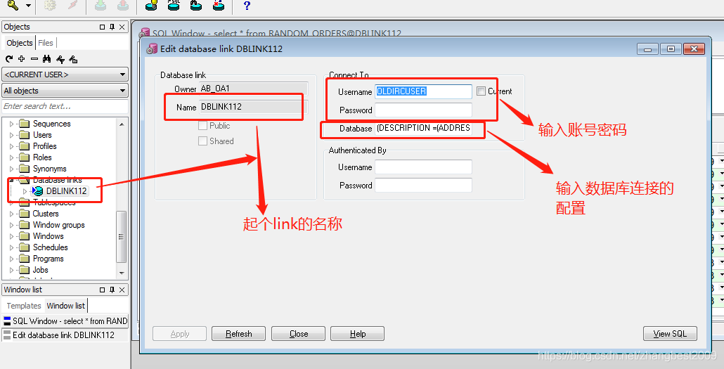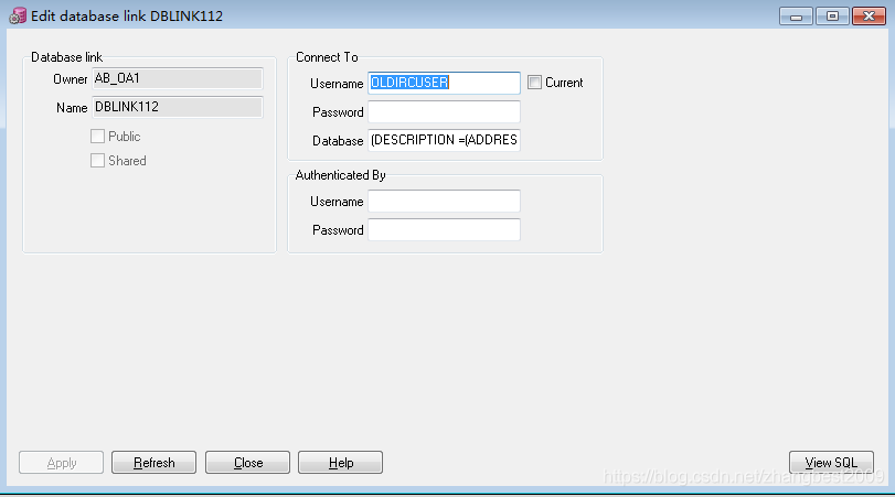 填写好dblink的名称、输入要访问的数据库的账户密码、数据库配置字符串,点击apply即可,如下: