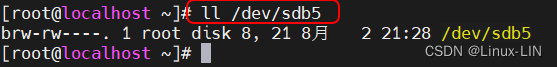 格式化完成后,输入ll /dev/sdb5查看格式化完毕后的分区文件类型信息