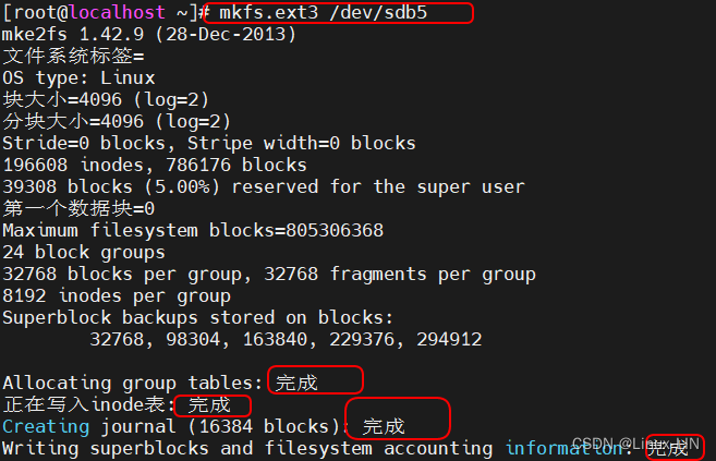 命令行输入 mkfs.ext3 /dev/sdb5 意思是对格式化根下的sdb5分区,格式化类型为ext3