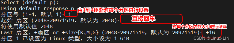 此时 直接回车位置表示选择输入起始位置,也就是起始扇区。当然,我们不用输入,直接回车就好进入下一步。它就是为了能够将后面的所有可用扇区充分的利用上,而默认选择可用扇区的起始最小扇区。