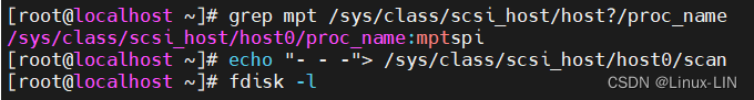 //使用下面命令扫描SCSI总线# echo "- - -" > /sys/class/scsi_host/host0/scan