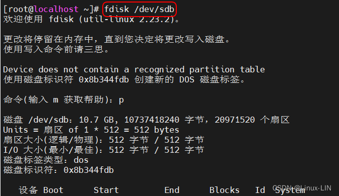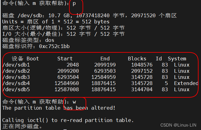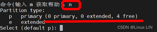 4.(1)fdisk /dev/sda 使硬盘进入分区模式