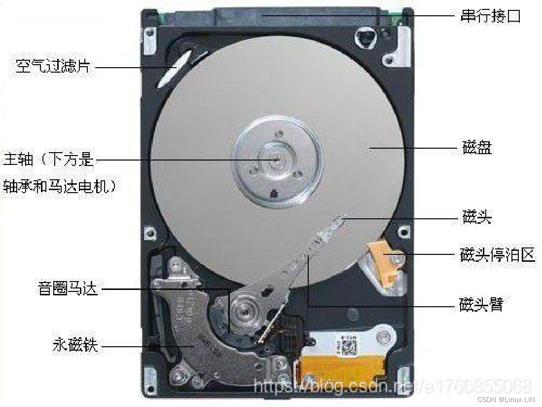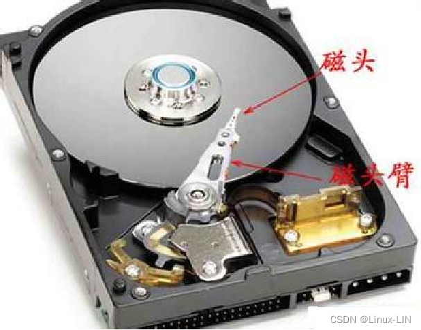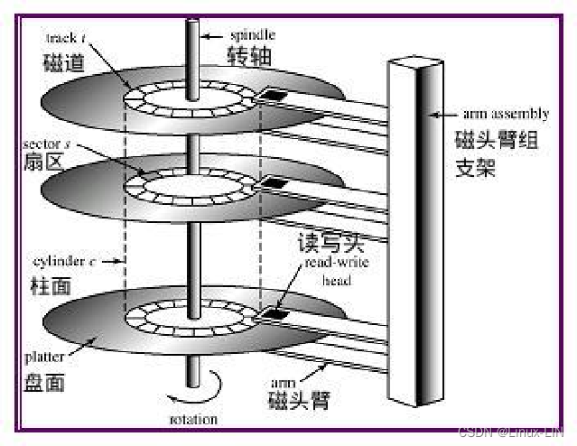 2.磁盘运行机理:多个盘片之间靠主轴连接,电机带动主轴做旋转运动,通过多个磁头臂的摆动和主轴的旋转,磁头就可以在磁盘旋转的过程中读取到磁盘中存储的各种数据
