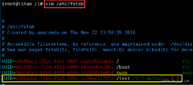 2. 在将光标移到UUID行,在命令模式下按o键进入插入模式,同时换行。将(4)步骤中复制好的sda5的UUID编号,粘贴进来。/test挂载点目录,ext3文件系统类型,第一个0表示不备份,第二个0表示不检查。注意格式一定要正确,可以不用对齐,最好的判断依据是依照颜色。写完之后保存退出。