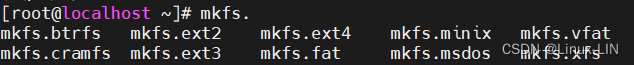 Linux下的文件类型有:ext2、ext3、ext4、xfs等等,我们可以使用命令: mkfs . 然后用按TAB TAB来查看有哪些文件类型