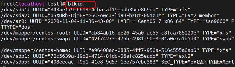 (4)命令blkid:查看对应分区的UUID(编号)。UUID唯一标识每一个分区,防止错误的挂载。除此之外,还会显示分区的类型。(建议先复制一下sda5的UUID,一会儿会用到)