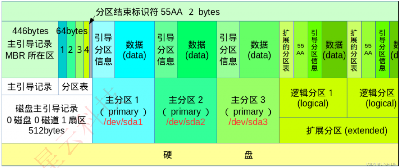 1.定义: MBR主引导记录( 让系统加载引导程序,找到启动镜像启动操作系统,加载分区表 )