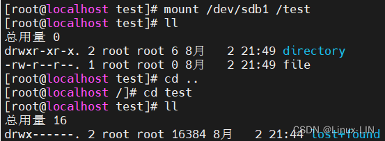 然后挂载sdb1,使用命令mount /dev/sdb1 /test 指将/dev/sdb1挂载到/test下