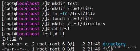 首先在/目录下创建一个test目录用于测试,在test目录中创建一个文件file和一个目录directory