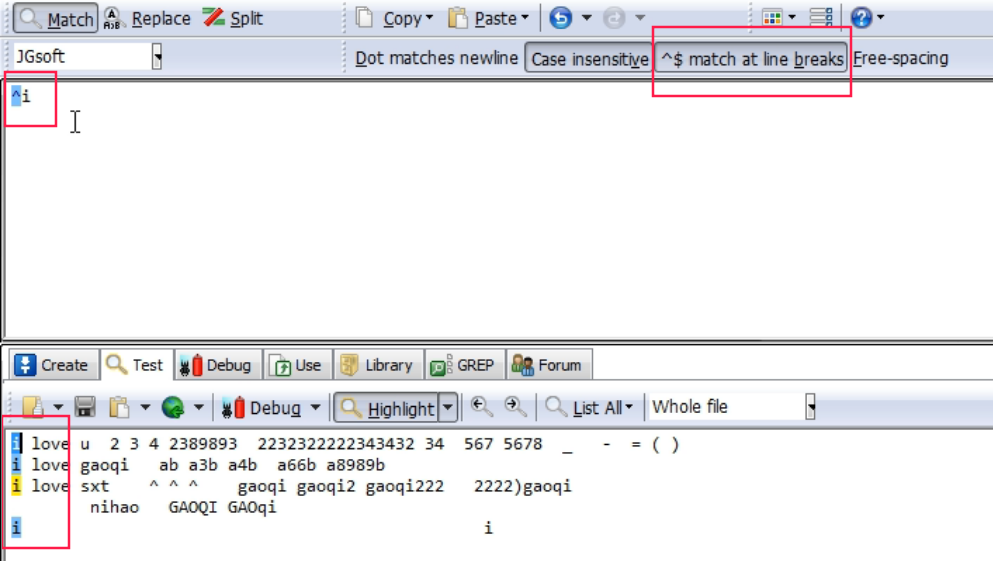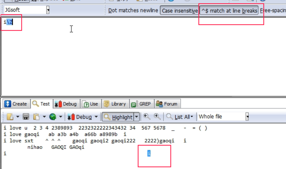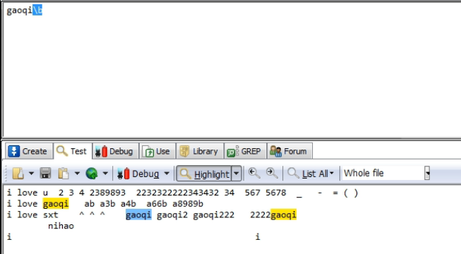 /* * 测试正则表达式的基本用法 * */ public class Demo01 { public static void main(String[] args) { //在这个字符串:asfsd23323,是否符合指定的正则表达式:\w+ //表达式对象 Pattern p = Pattern.compile("\\w+"); //创建Matcher对象 Matcher m = p.matcher("asfsd&&23323"); boolean result = m.matches(); //尝试将整个字符序列与该模式匹配 System.out.println(result); //该方法扫描输入的序列,查找与该模式匹配的下一个子序列 boolean result2 = m.find(); System.out.println(result2); System.out.println(m.group()); while (m.find()) { System.out.println(m.group()); //group(),group(0)匹配整个表达式的子字符串 System.out.println(m.group(0)); } } }