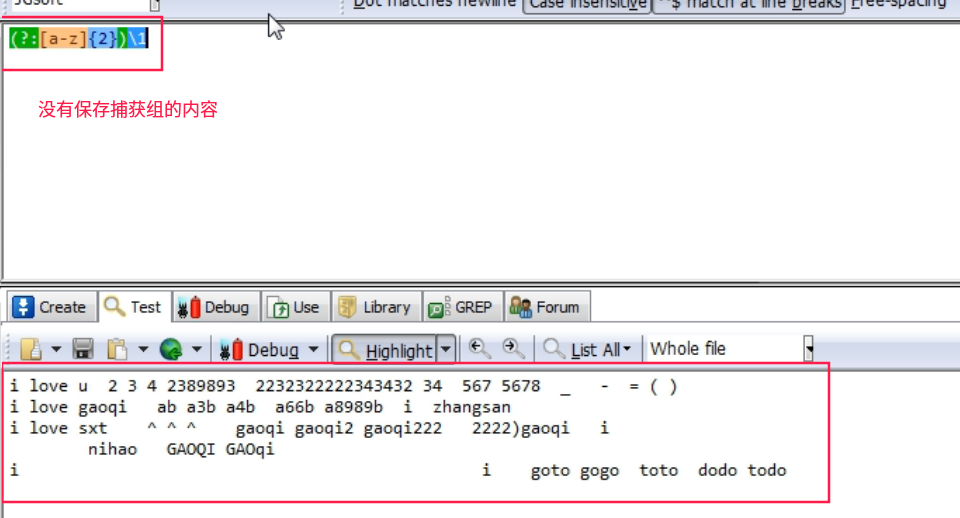 /* * 测试正则表达式对象中分组的处理 * */ public class Demo02 { public static void main(String[] args) { //在这个字符串:asfsd23323,是否符合指定的正则表达式:\w+ //表达式对象 Pattern p = Pattern.compile("([a-z]+)([0-9]+)"); //创建Matcher对象 Matcher m = p.matcher("aa232*ssd445*sds223"); while (m.find()) { System.out.println(m.group(0));//匹配到整个表达式的子字符串内容 System.out.println(m.group(1));//匹配到第一个表达式的内容 System.out.println(m.group(2));//匹配到第二个表达式的内容 } } }