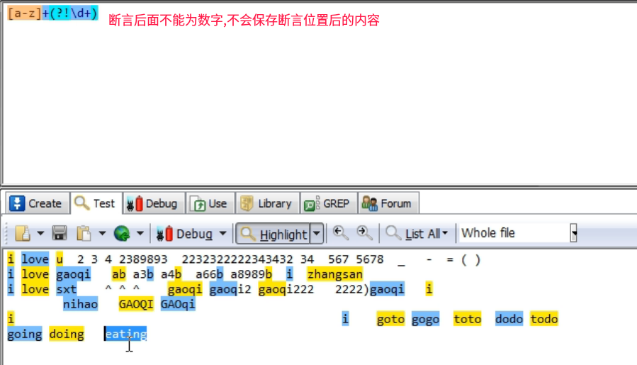 只进行子表达式的匹配,匹配内容不计入最终的匹配结果,是零宽度
