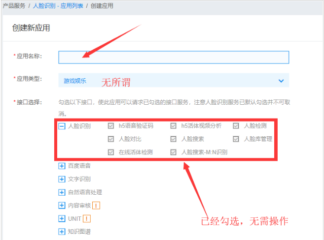 注册完成后(或者直接扫码登陆),进入管理控制台->产品服务->人工智能->人脸识别->创建应用->填写必要信息->立即创建