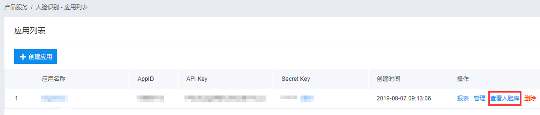 至此,我们已经创建好了人脸识别的应用。接下来,进入应用列表,找到我们才新建的应用,查看人脸库,我们需要创建用户组(用来集中管理小程序的用户人脸照片)